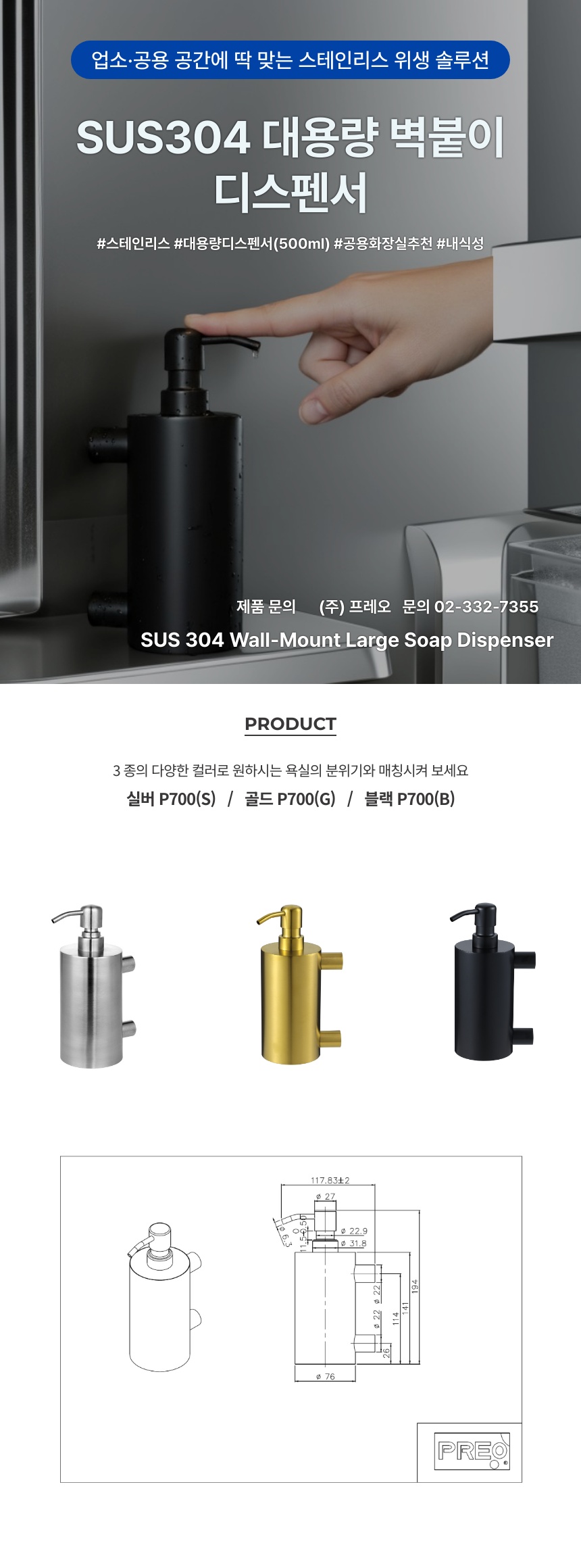프레오 물비누 디스펜서 벽붙이 대용량(500ml) 골드
