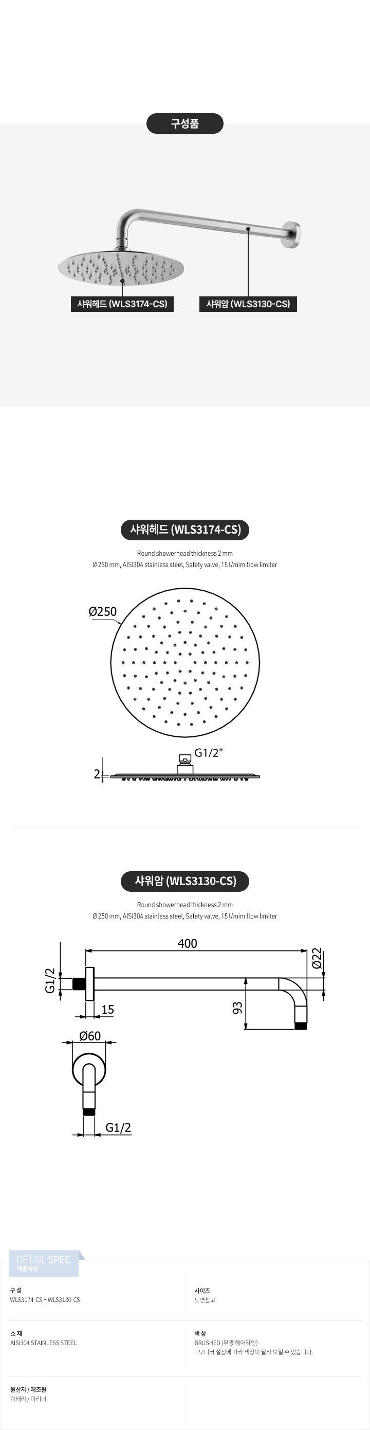 오딧세이 원형 250mm 샤워헤드세트 브러쉬드 크롬