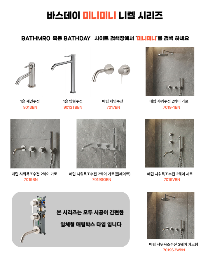 미니미니 매립샤워욕조수전 2웨이 세로, 미니미니 매립 샤워욕조수전 2웨이 가로 사각 플레이트형, 미니미니 매립 샤워욕조수전 3웨이 가로형, 미니미니 니켈 탑볼 세면수전, 미니미니 2WAY 벽매립 샤워수전 니켈, 미니미니 니켈 벽매립세면수전 BDF-7017BN, 미니미니 니켈 1WAY 매립믹서, 미니미니 니켈 1홀 세면수전
